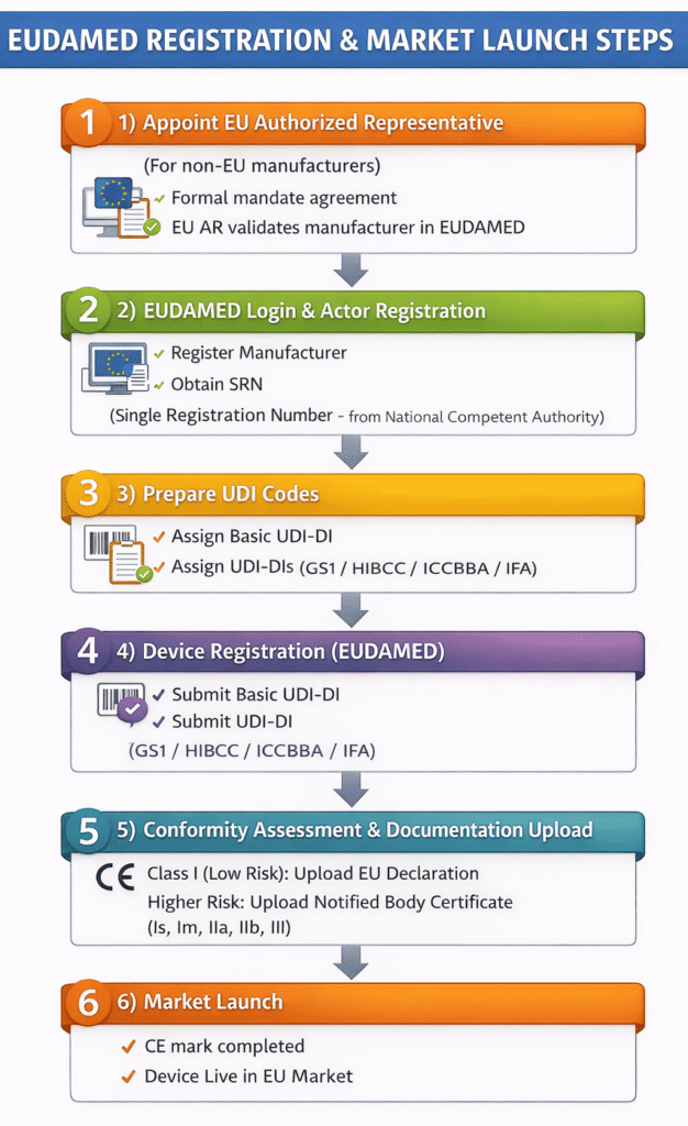 EUDAMED registration should be completed after technical documentation is prepared and before applying to a Notified Body for conformity assessment, where applicable. Completing EUDAMED registration early helps avoid delays in CE marking and ensures a smoother path to EU market launch.