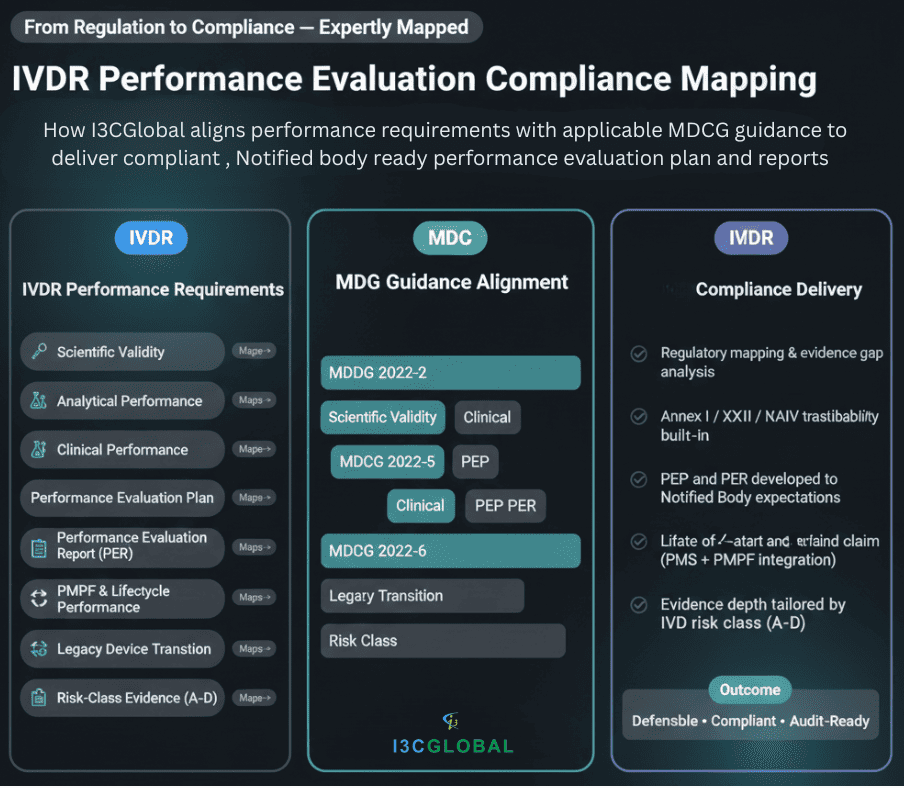 An IVDR performance evaluation report (PER) is the cornerstone of your technical file. It serves as the primary evidence to demonstrate that your device achieves its intended purpose and maintains a high level of safety and efficacy and also it validates the clinical evidence for your product throughout its lifecycle. At I3CGLOBAL, our regulatory experts meticulously bridge the gap between Annex XIII requirements and the latest MDCG frameworks, architecting performance evaluation reports where every pillar from Scientific Validity (MDCG 2022-2) to Legacy Transitions (MDCG 2022-6) is engineered for total Notified Body alignment.