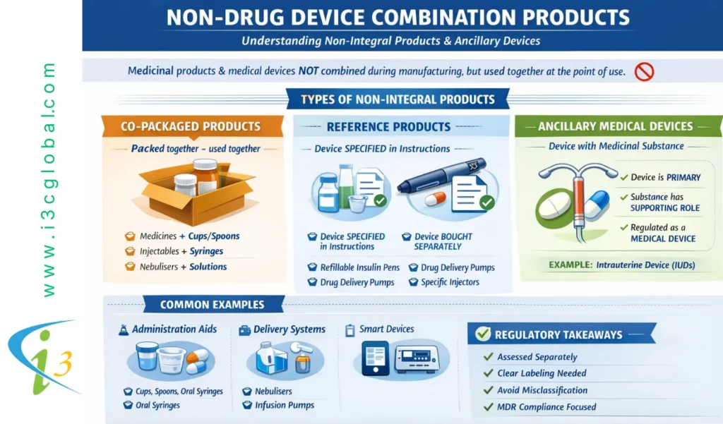 Medicinal and device components that are not physically integrated during manufacturing but are combined before human administration, so-called non-integral products, are not covered in drug-device combination products. Such types of products are detailed below.