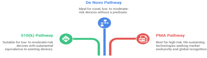The De Novo pathway caters to novel, low- to moderate-risk devices that lack a predicate but do not meet Class III risk criteria. It allows manufacturers to establish a new device classification and predicate for future 510(k) submissions. In contrast, PMA is the gold standard for high-risk, life-sustaining technologies, offering unmatched regulatory credibility, market exclusivity, and global recognition.
