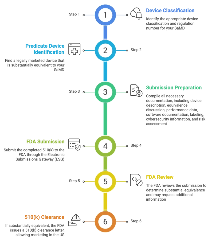 Obtaining 510(k) clearance for SaMD requires a thorough understanding of the regulatory requirements and a well-documented submission that demonstrates substantial equivalence to a predicate device. By following the steps outlined in this document and addressing the key considerations, manufacturers can increase their chances of successfully navigating the FDA’s premarket notification process and bringing their SaMD products to market. Consulting with regulatory experts can also be beneficial in ensuring compliance with all applicable regulations.